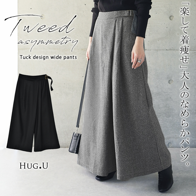 楽天市場 ワイドパンツ タックパンツ 一部5月中旬入荷 パンツ レディース フレアパンツ ツイードパンツ 卒業式 入学式 スーツ ツイード ボトムス オフィスカジュアル ロング ワイド タック きれいめ 春 夏 黒 グレー カーキ 無地 大きいサイズ 3l Ll 2xl Hug U